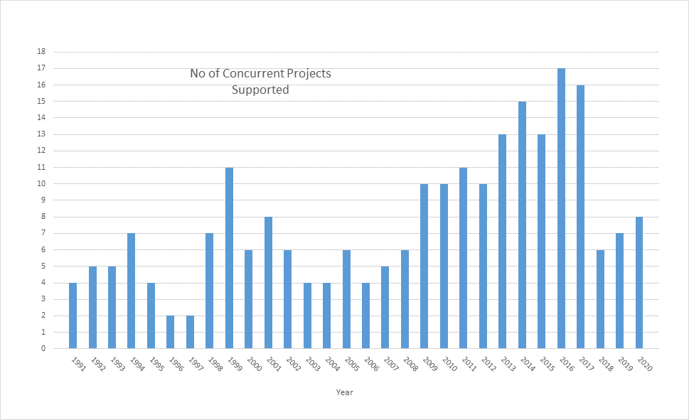 Grants are made to projects, rather than people, that is they will not be "Scholarships". For B.Sc.(Hons.) and M.Sc. projects, annual grants of up to $5,000 will be made to the Tertiary body responsible for the project - usually a University. Additional funds beyond $5,000 could be provided in exceptional cases, at the discretion of the ASEG Research Foundation. The graph below plots the number of concurrent projects supported since 1991.
