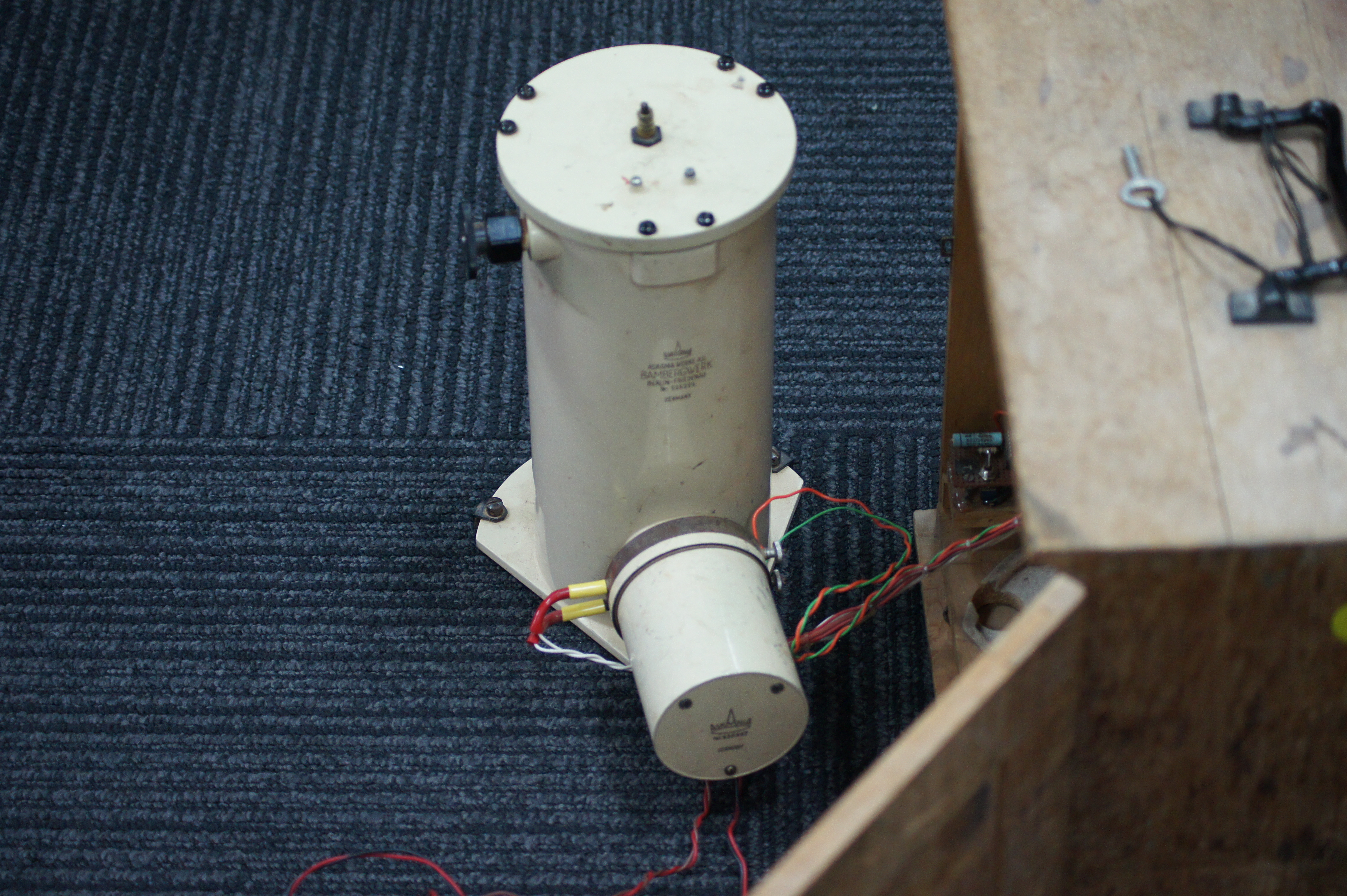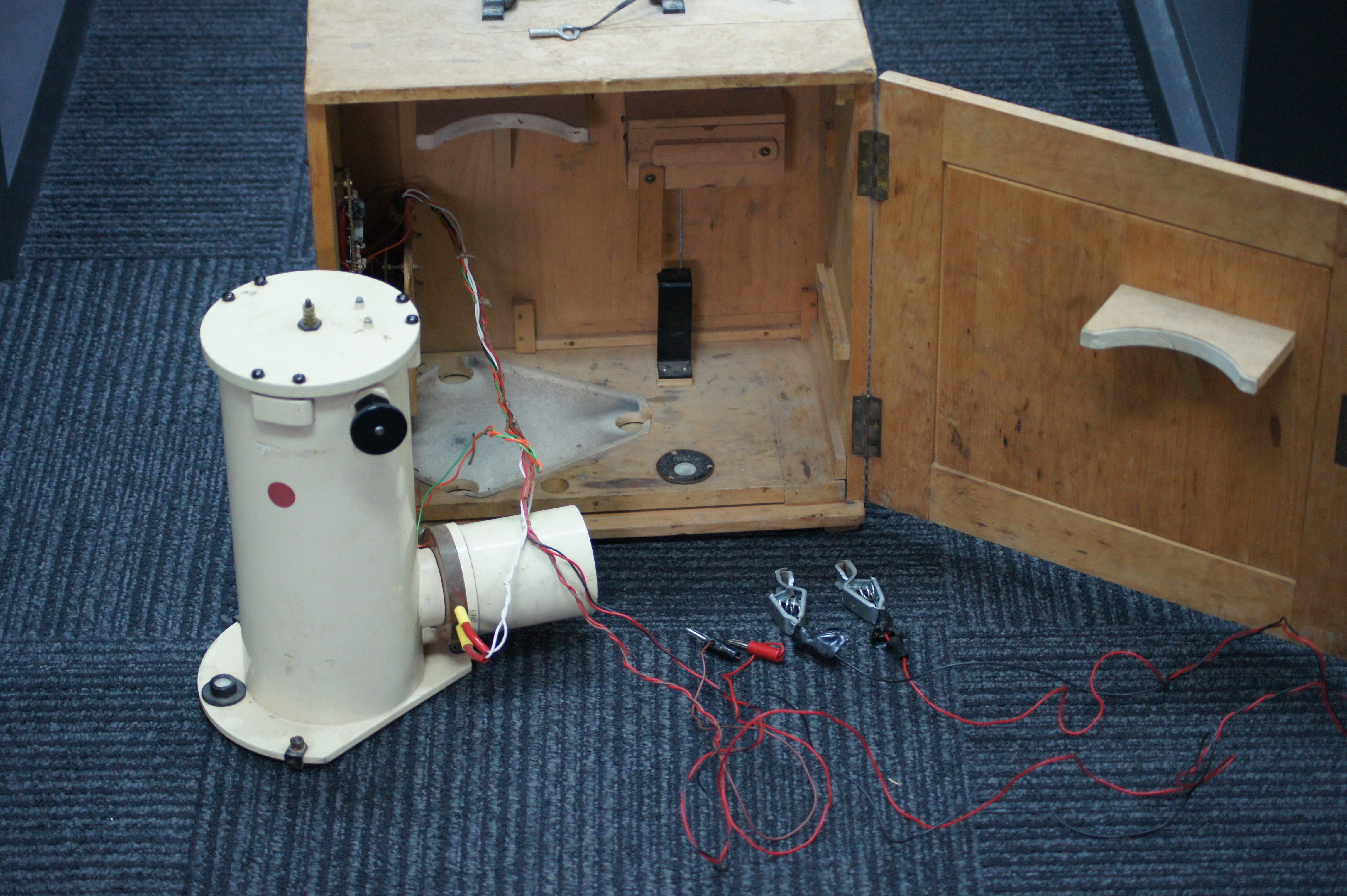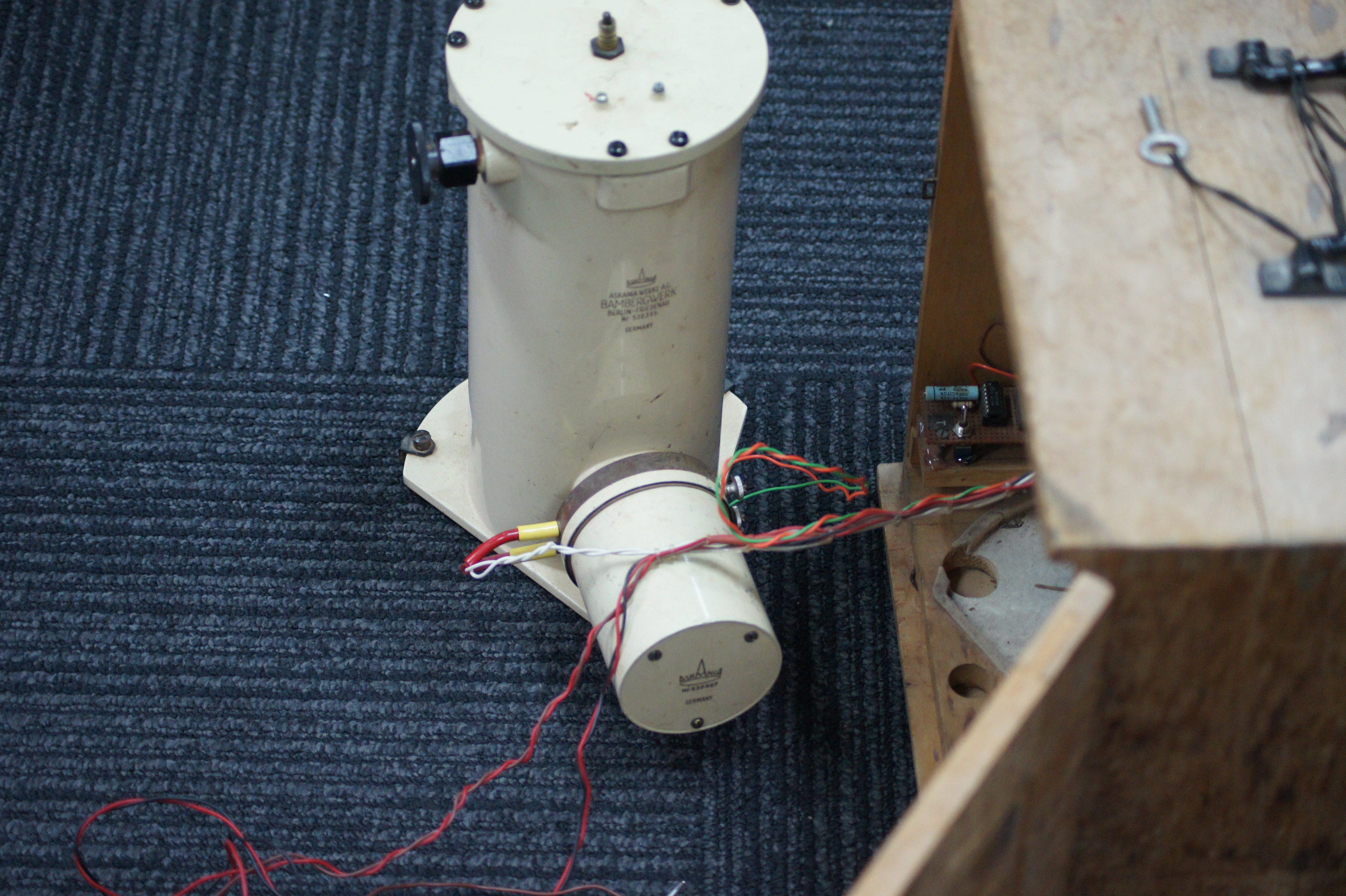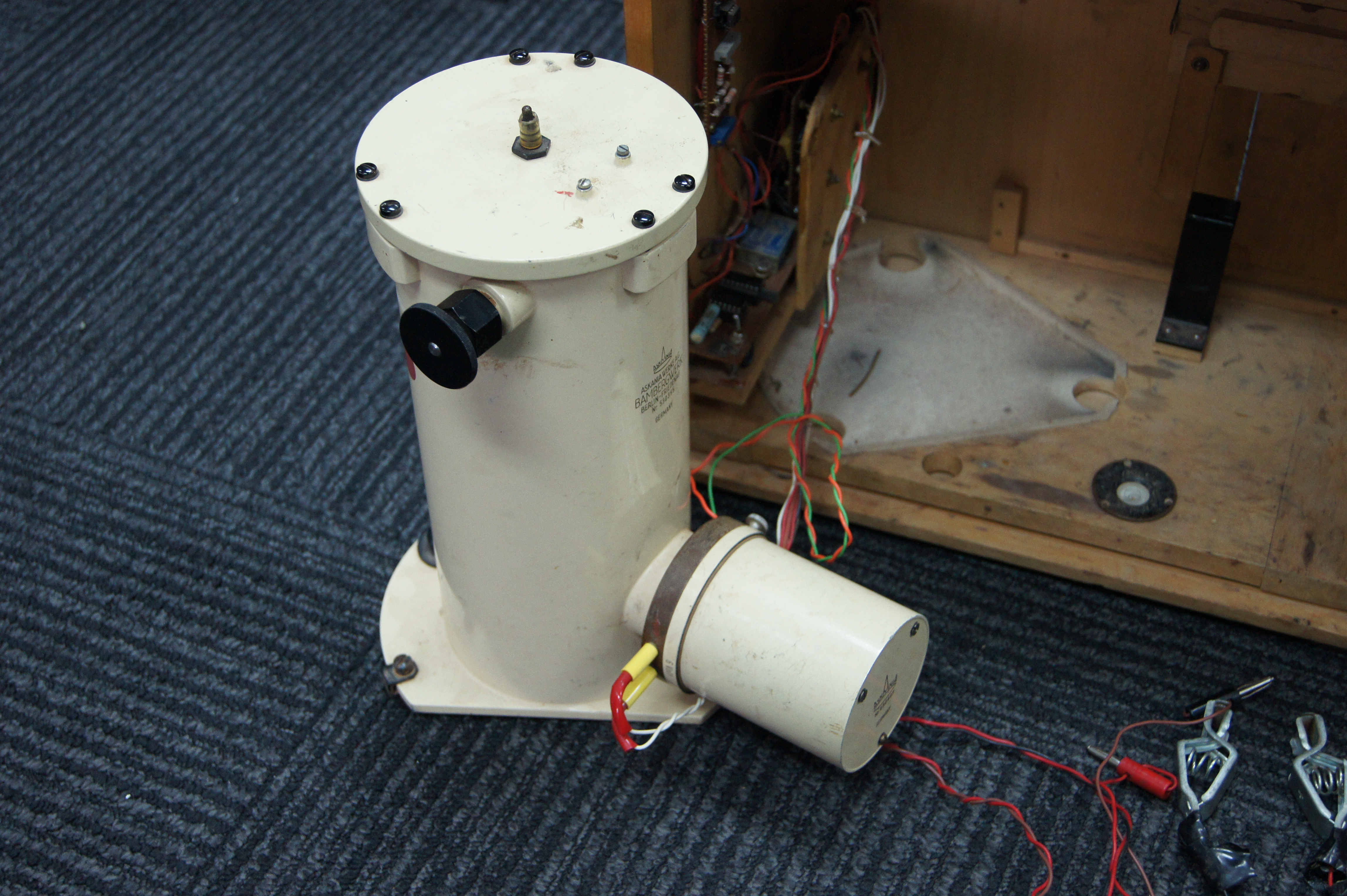 This German built Askania Variograph records long period geomagnetic variations. It houses three independent optical systems for the three magnetic field components using mirrors mounted on small magnets. After careful levelling, orientation and calibration, it records the three components on film at the rate one inch per hour. After a few days, the film box is extracted and sent to a lab to be developed.