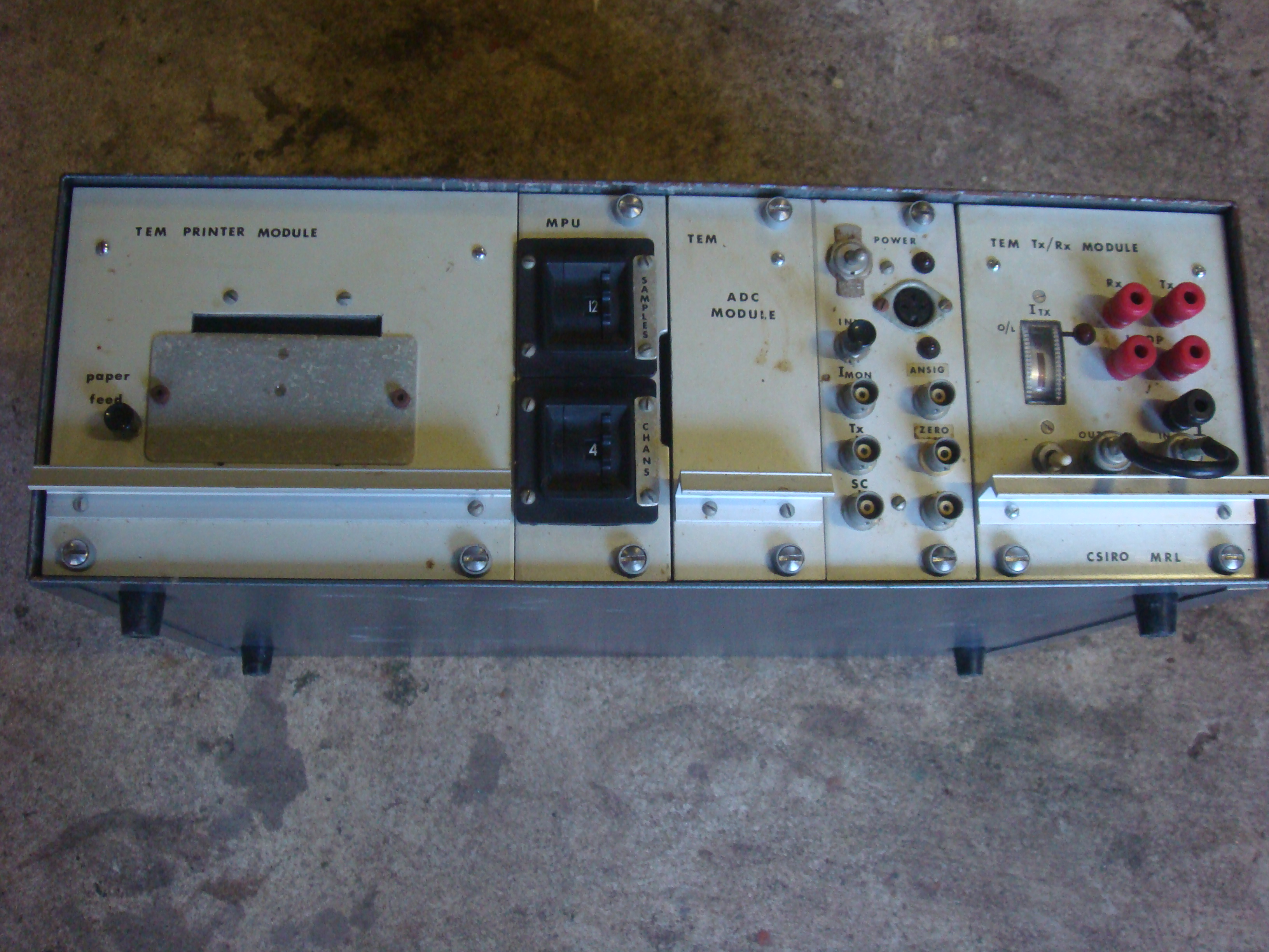 Shown is the original, sole prototype of the SIROTEM series of TEM equipment held in the ASEG historic instrument collection. Developed from 1972 in the Mineral Physics division of the CSIRO, it led to the design of three ever-improved models of SIROTEM in the next 30 years. It was the first geophysical instrument in Australia to incorporate a microprocessor which, utilising originally, the software instruction set of the PDP-8 computer, enabled digital manipulation of data in the field. The available memory then was about 6 kilobytes. The total weight of the instrument was 8 kg, easily portable by one person. From right to left, the modules shown are: Tx-Rx (transmitter-receiver), Power, ADC (analogue-to-digital), MPU (microprocessor unit), and Printer for recording the transient response.