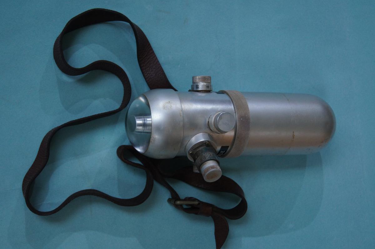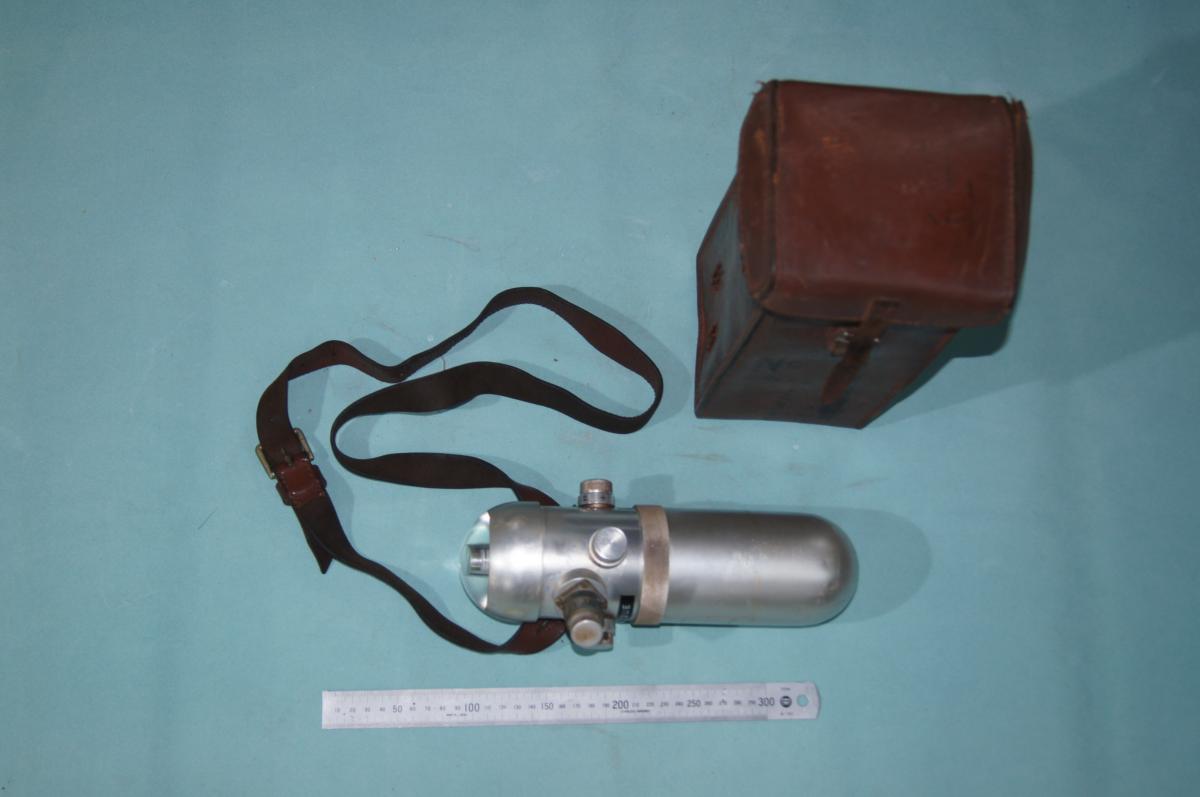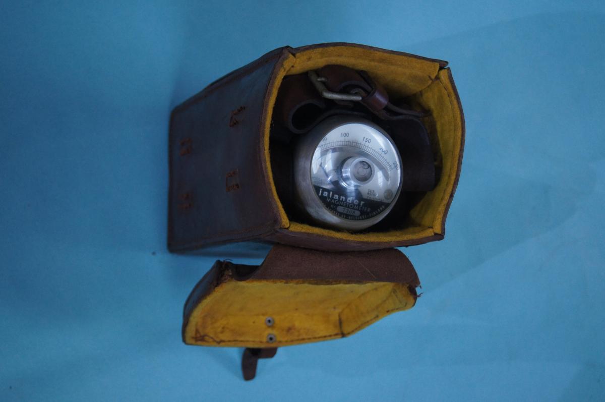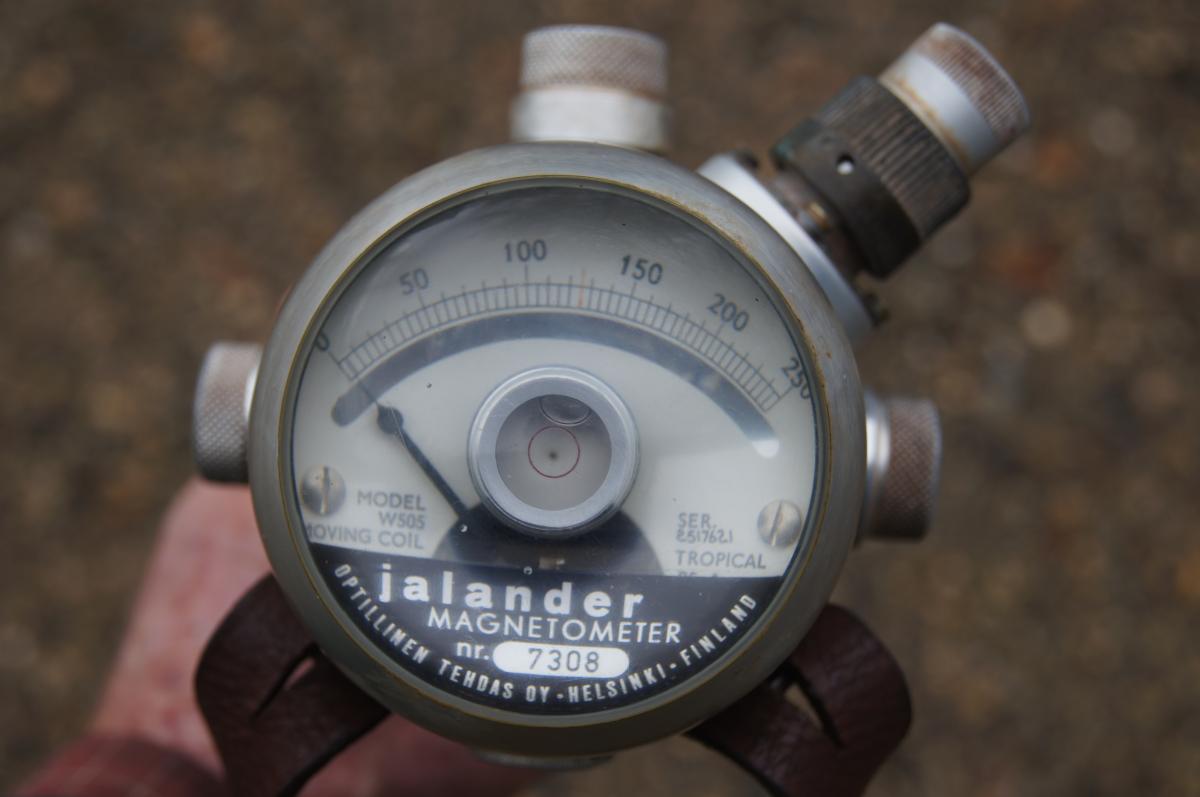 Electronic fluxgate technology was developed during WWII. The fluxgate module is mounted internally concentric with the instrument housing. To operate, after turning the instrument on, it must be suspended to hang vertically and steadied to align the levelling bubble in the centre of its bull’s eye. When steady, the relative value of the vertical component of the magnetic field can be read off the analogue scale. A switch can be used to select the most appropriate range scale. The typical measurement time is about 15 seconds and best resolution is 10 nT.