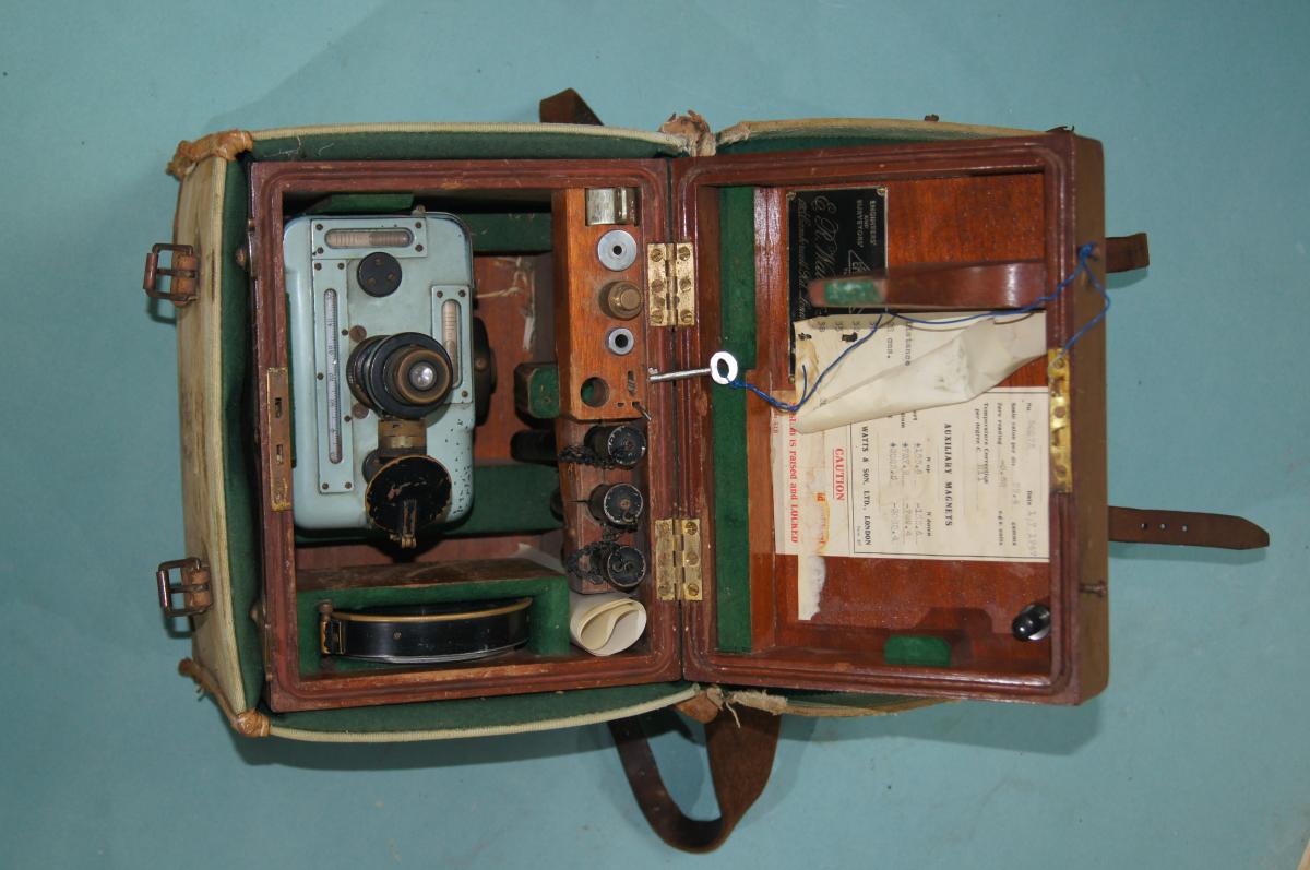 The calibration record for this instrument indicated that 1 scale division equalled 29.4 nT and that consecutive readings were repeatable to 0.1 of a division, or 2.94 nT. Temperature compensation for this instrument was adjusted to zero over a temperature range of 15 to 55 degrees C. Measurement first required precise levelling of the instrument on a tripod, unclamping the mechanism, recording the temperature and then reading the scale through a microscope. The centre value was set at 52,000 nT. Setup and measurement time was typically 1 minute for an experienced operator.