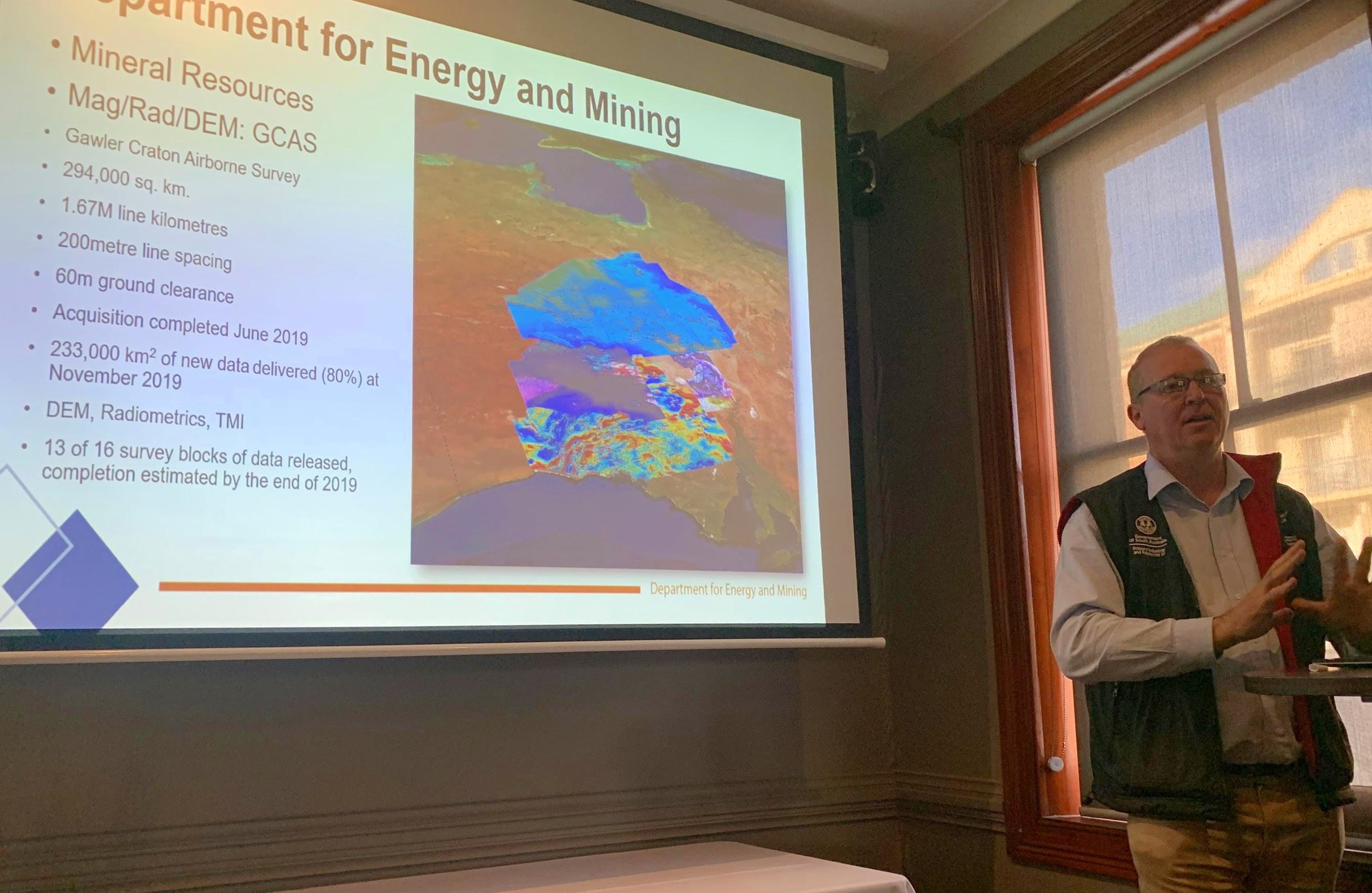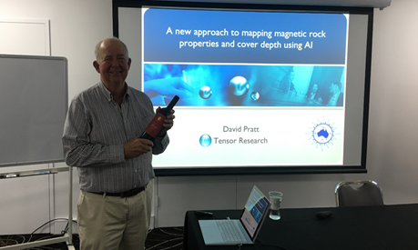 ASEG NSW: Dr Dave Pratt, the ASEG NSW September speaker just after receiving the speakers gift. The presentation was titled, 'A new approach to mapping magnetic rock properties and cover depth using AI.'