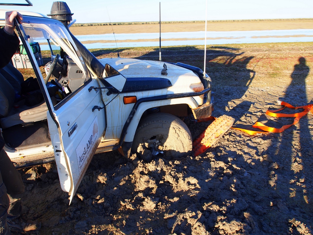 I call this memory type 2 fun. Not fun at the time, but a very fond memory now I look back on. It was late in the afternoon (how all good stories start) and I was driving the straight dirt track along NSW/SA dog fence after deploying some MT stations with Kate Robertson. Suddenly I realised the dirt track I was driving on was now 10 metres to my left, and I was driving through a dried-up depression FULL OF BLACK CLAY. The car only got so far before the thick clay caught us, and we were bogged. We spent hours trying to get maxi traxs to take and dig ourselves out, but the car was sinking - and there was no way we were getting out of this thick black clay. Kate & I drew straws to call in over the radio to the nearby homestead, who came to our rescue - not before taking a number of photographs of the car. They offered a high pressure hose down (for the car, not us), some lasagne, a room for the night - and some kind words, saying there was no way we would be able to dig ourselves out of that black clay.