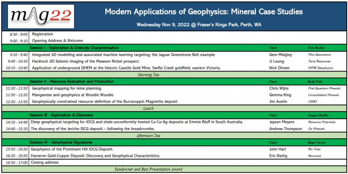 In November, 2022 the WA branch of the ASEG held MAG22: Modern Applications of Geophysics: Mineral Case Studies. Where presenters have consented, talks have been uploaded below. The final program for the event can be found here .